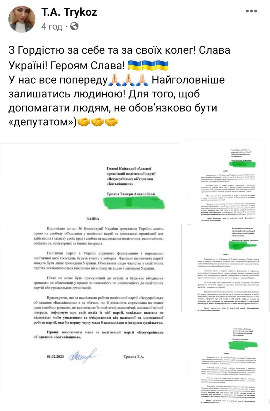 Відповідну інформацію, підтверджену підписаними заявами, поширила 1 лютого на своїй сторінці у мережі Фейсбук депутат Тамара Трикоз.