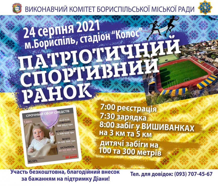 Запрошуємо спортсменів, любителів, патріотів та небайдужу громаду Борисполя взяти участь в традиційному Благодійному заході від Управління молоді та спорту, який відбудеться 20 січня по вул. Соборна. Забіг на дистанції на вибір: одне коло туди і назад складає 1300 метрів (можна обрати до 5-ти кіл).
