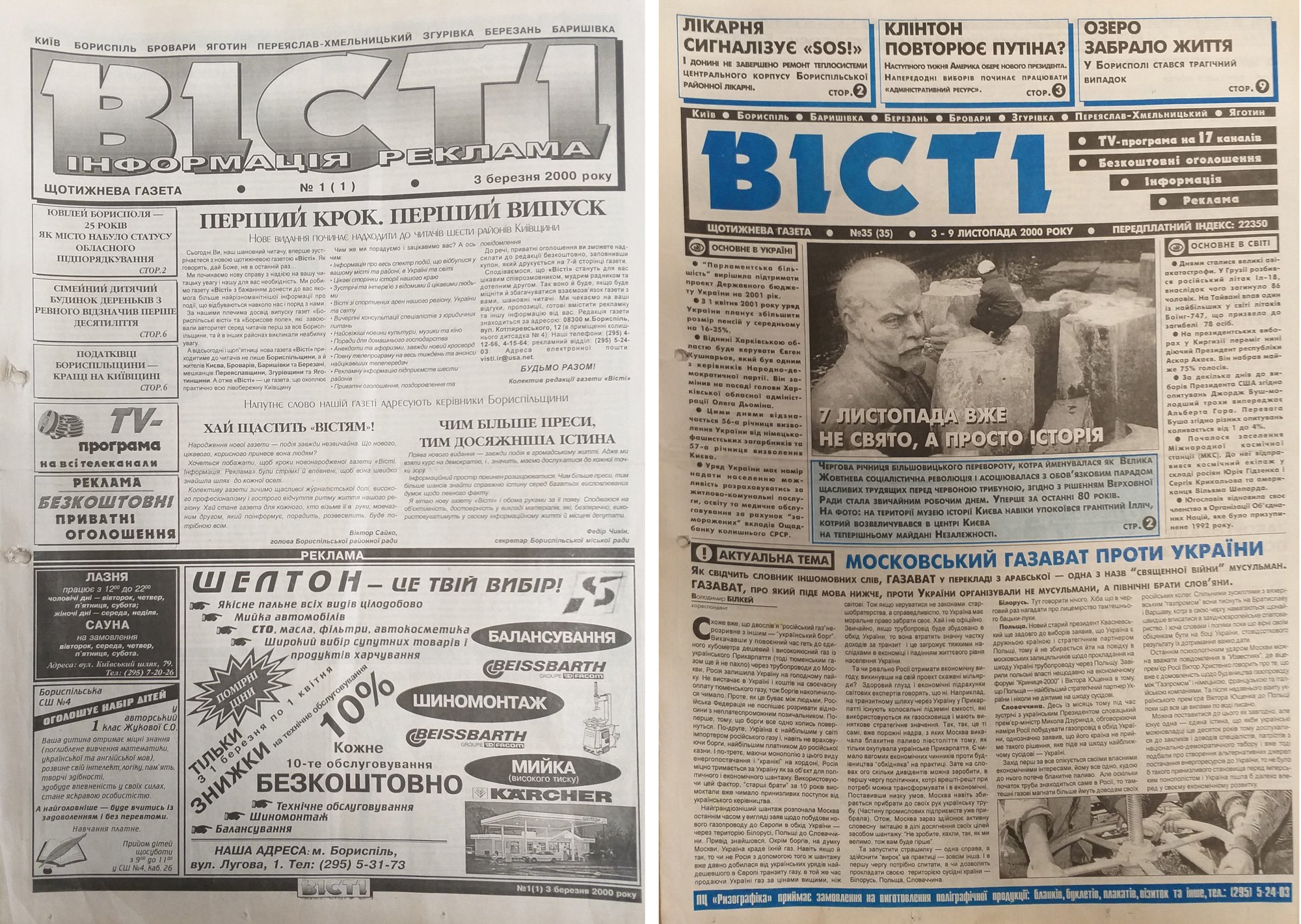 3 березня 2000 року побачив світ перший номер першого незалежного друкованого періодичного видання Борисполя, що розповсюджувалося на лівобережжі Київської області — щотижневика «Вісті.Інформація.Реклама».