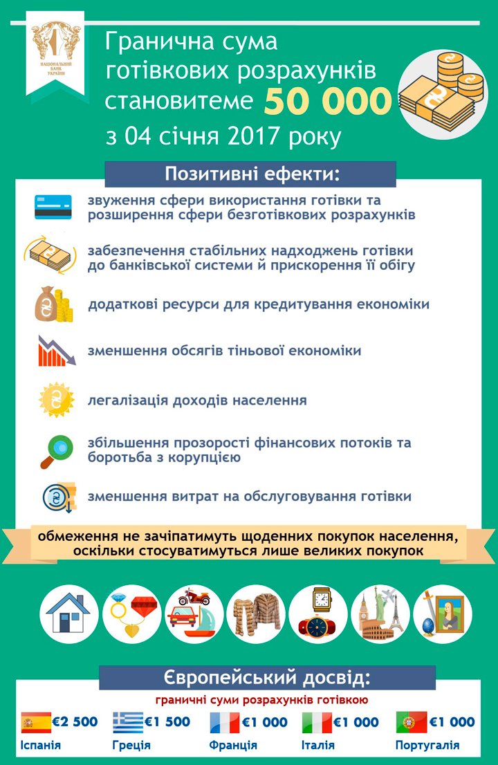 Національний банк України анонсує зниження з 4 січня граничної суми розрахунків готівкою за участю фізичних осіб зі 150 тисяч гривень до 50 тисяч гривень.