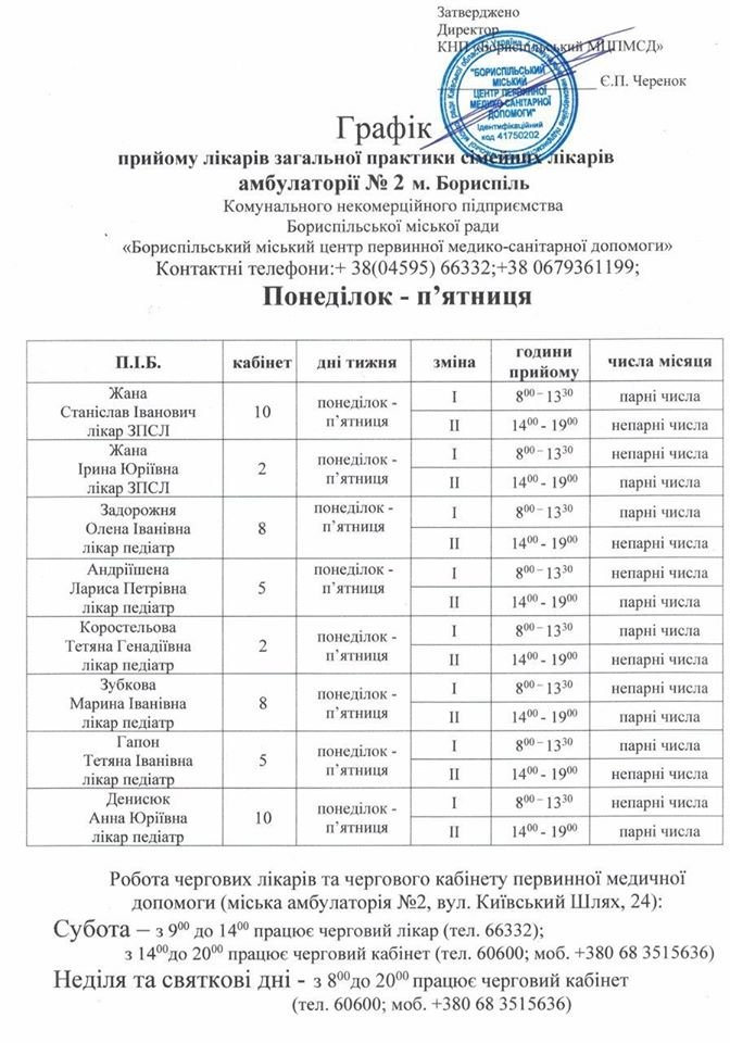 КНП «Бориспільський міський центр первинної медико-санітарної допомоги» інформує про тимчасову зміну режиму роботи та прийому лікарів міських амбулаторій під час впровадження карантину та режиму надзвичайної ситуації в Київській області!