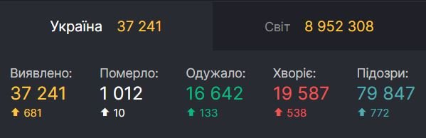 З 37 241 лабораторно підтверджених випадків COVID-19 - 1012 летальні, 16 642 пацієнти одужало.
