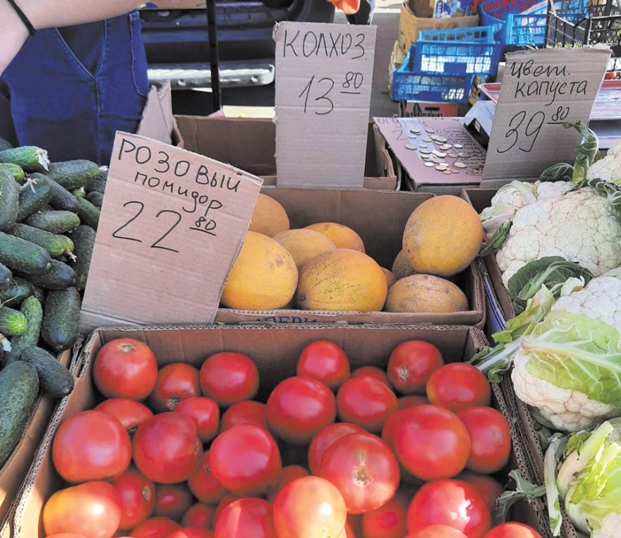 Значно дешевші, ніж в центрі міста, на ринку овочі. У рядах ціни стандартні – картопля 15 грн за кг, огірки –35 грн, кабачки – 15 грн, морква – 15 грн. Тим, хто хоче знайти дешевше, треба рухатися в кінець ринку, де торгують із машин. Там ціни більш демократичні. Чудові помідори з Херсону – 22 грн за кг, огірки – 22 грн, перець – 54 грн.